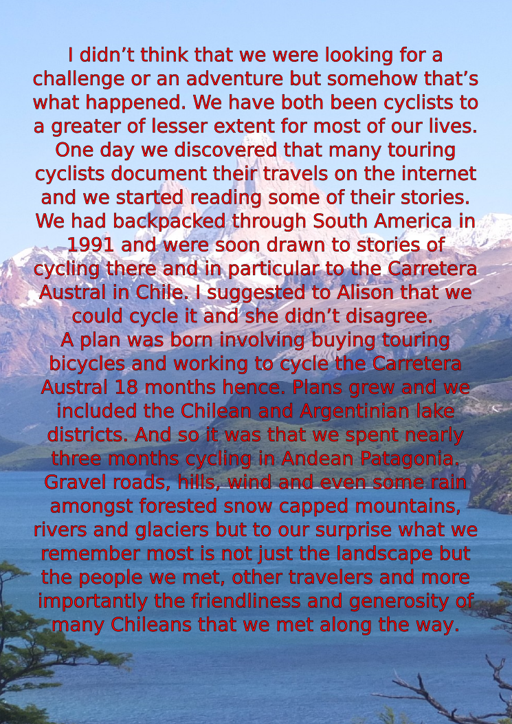 This is the home of my eBook of our three months touring by bicycle in Patagonia, the Lake Districts and the Carretera Austral in Southern Chile and Argentinia over the summer of 2013/2014. This page is under deveopment as a photo gallery to accompany the book.